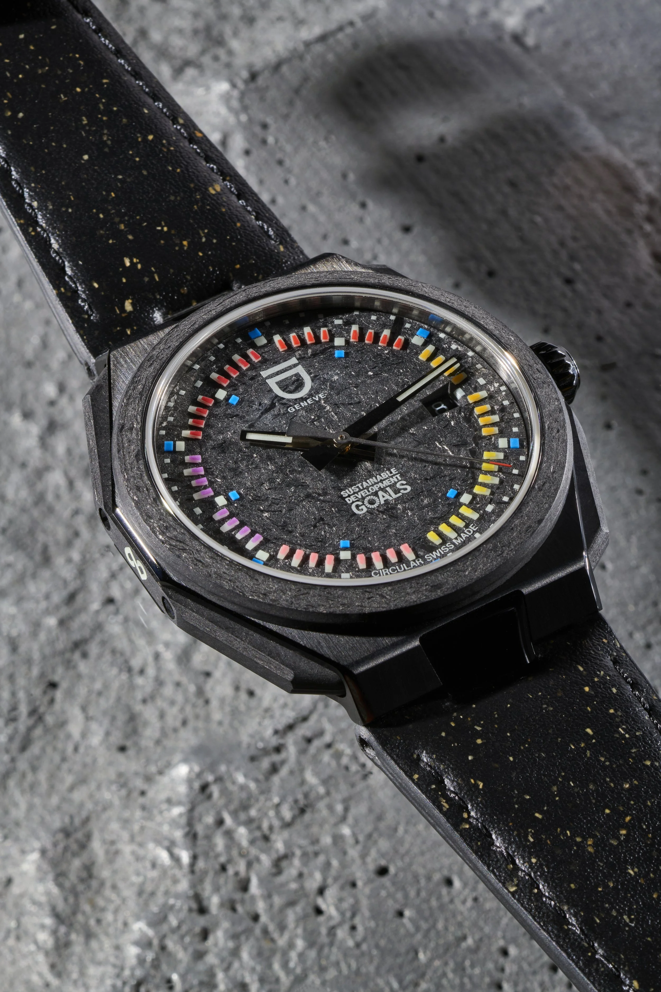 Le cadran réinterprète la roue des couleurs des ODD : des tons chauds dégradés colorent la piste des minutes, combinés à des index d'un bleu profond pour une lisibilité intemporelle. Sur le fond du boîtier, chaque pièce est gravée d'un numéro unique de 1 à 17, faisant écho aux 17 ODD et garantissant que chaque montre est une incarnation singulière d'un objectif spécifique.